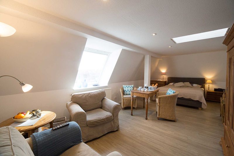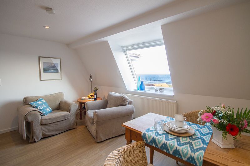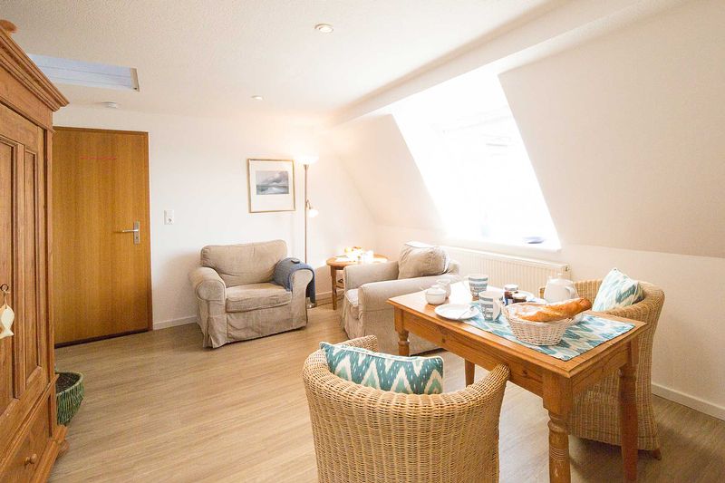 Die Wohnung 14 liegt in der dritten Etage im Ferienhaus Jungnamen Sand und zeigt Richtung Osten. Es finden 2 Personen auf 35 m² geschmackvoll eingerichteter Wohnfläche genügend Platz zum Entfalten.